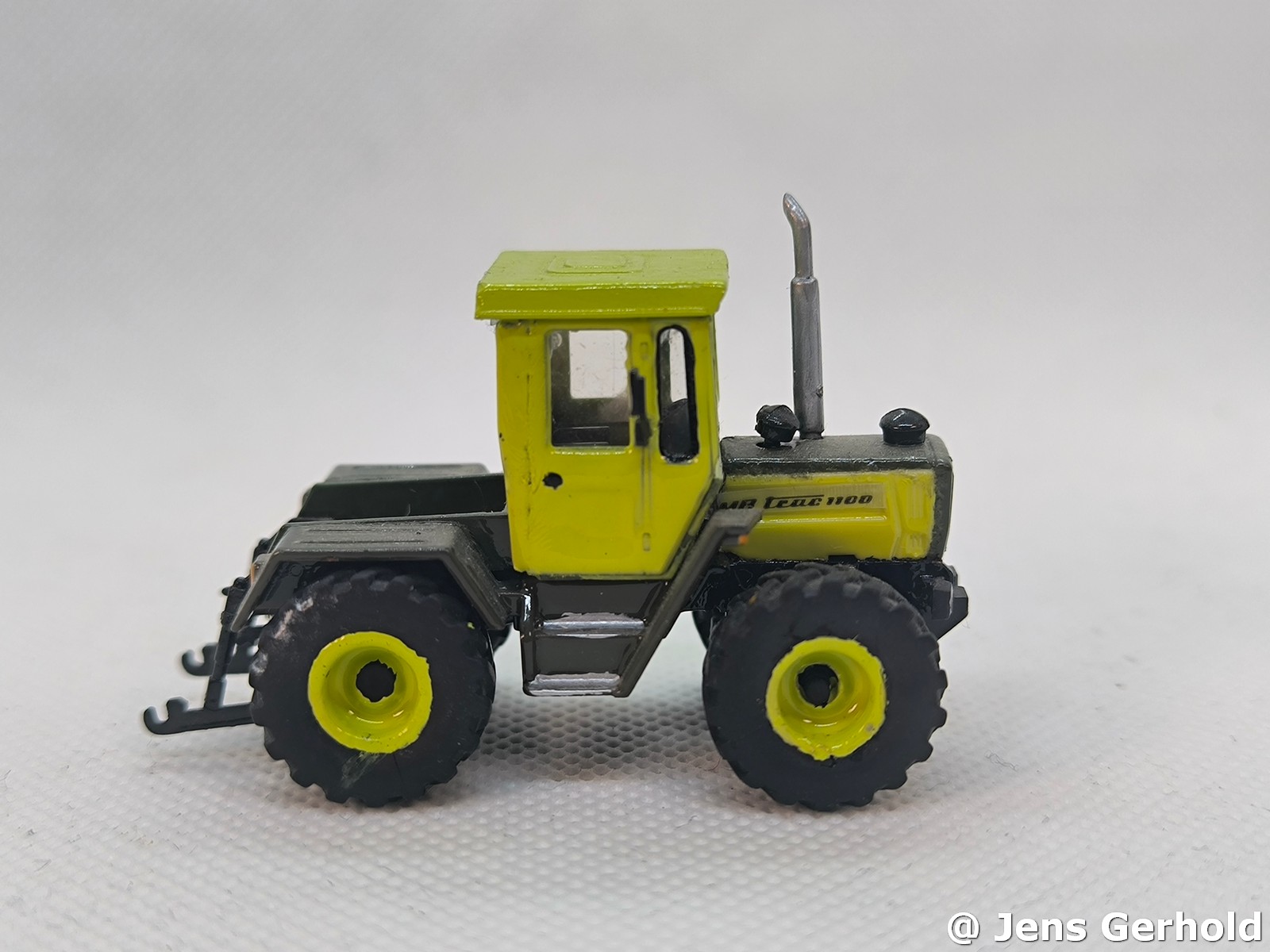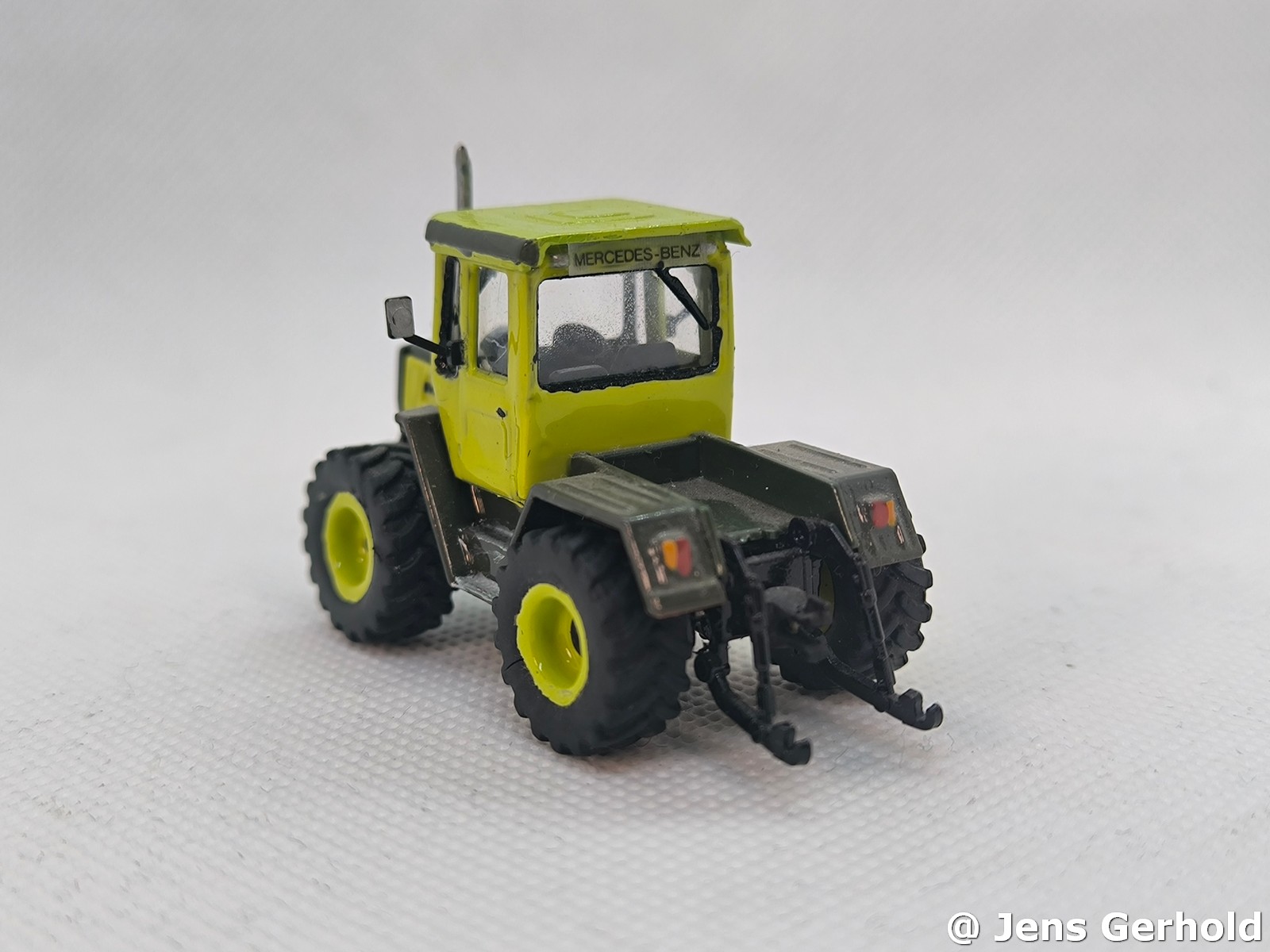 Das Modell wurde aus einem Kibri Bausatz (MB-Trac 1600) gebaut. Das Modell wurde gekürzt und den Maßen des MB-Trac 1100 angepasst. Die Kbine wurde verkleinert. Der MB-Trac wurde zum Schluß mit Airbrush uind Original Mercedes Farbe lackiert. Das Model enstand vor ca: 20 Jahren